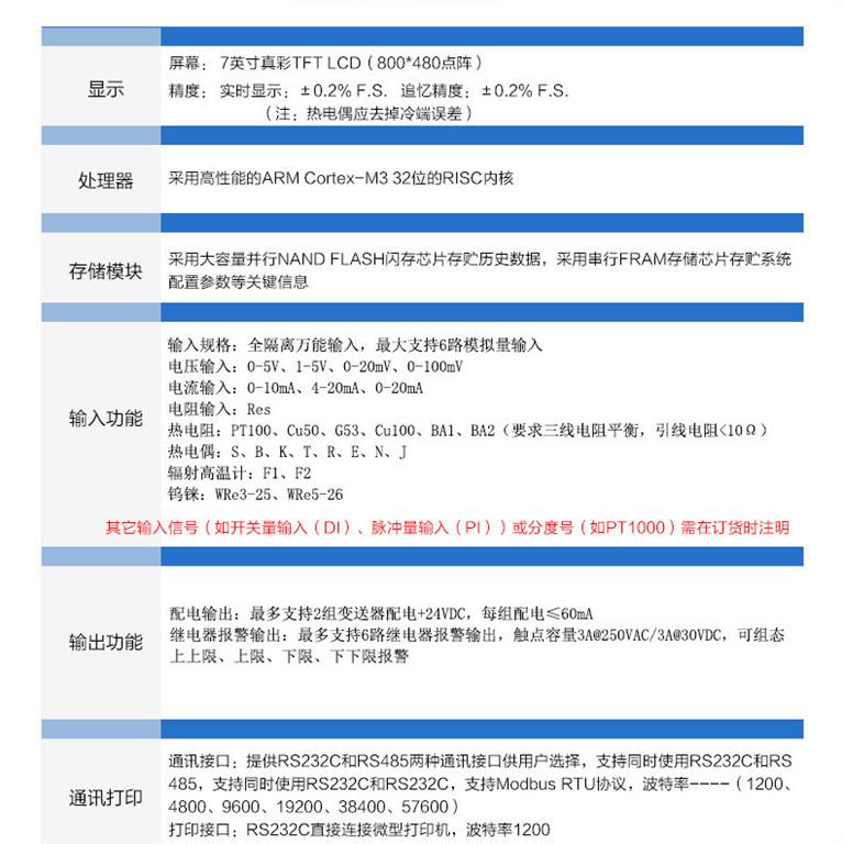 R7100系列超薄寬屏彩色無紙記錄儀1-16路wn****輸入(可組態(tài)選擇輸入:標準電壓、標準電流、熱電偶、熱電阻、頻率、開關(guān)量、脈沖等)??蓭?路繼電器報警輸出,6路饋電輸出,4個變送輸出,RS232/485通訊接口可選擇,藍牙功能,GPRS功能以太網(wǎng)接口,微型打印機接口和USB接口;饋電輸出可以給傳感器供電;R7100具有強大的顯示功能,實時曲線顯示,歷史曲線追憶,棒圖顯示,報警列表顯示,掉電列表顯示。精致的外觀設(shè)計、人性化操作界面、穩(wěn)定的功能體現(xiàn)、可靠的硬件品質(zhì)、精湛的制造工藝,使R7100具有更高的性能價格比。